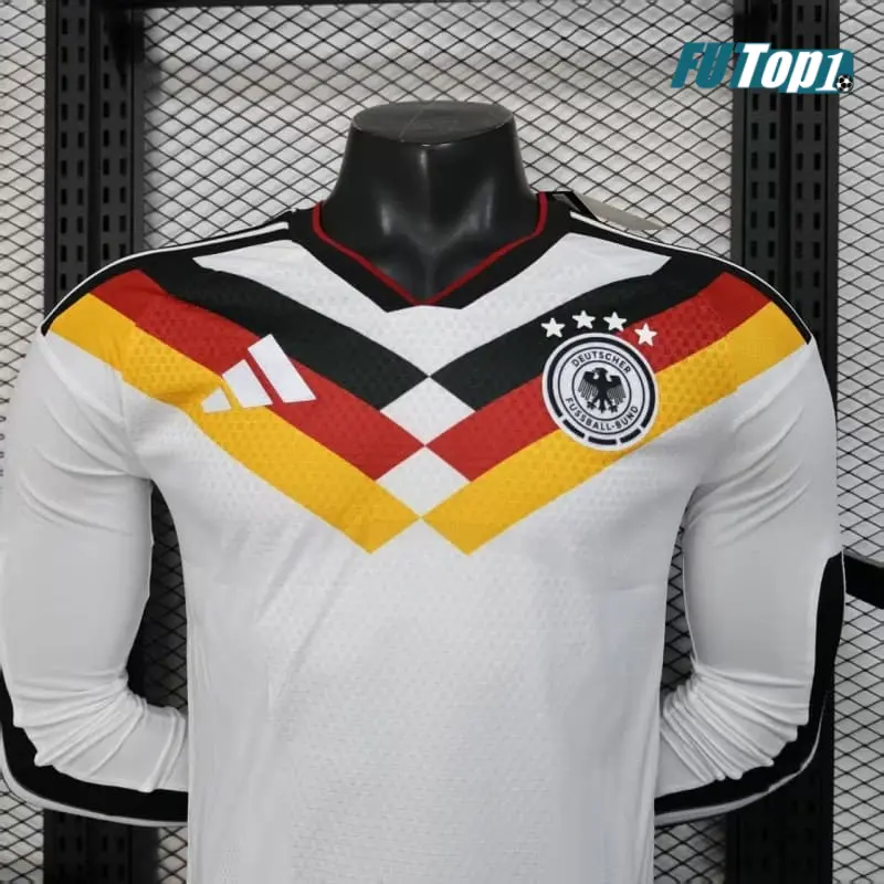- Diseño Moderno y Clásico: Con base blanca y detalles en tonos negro, rojo y amarillo, esta camiseta destaca por su estilo moderno inspirado en los clásicos de 1990 y 2014 de la Mannschaft, perfecta para los jóvenes hinchas de Alemania.
