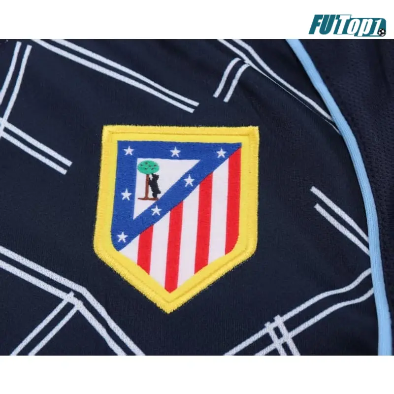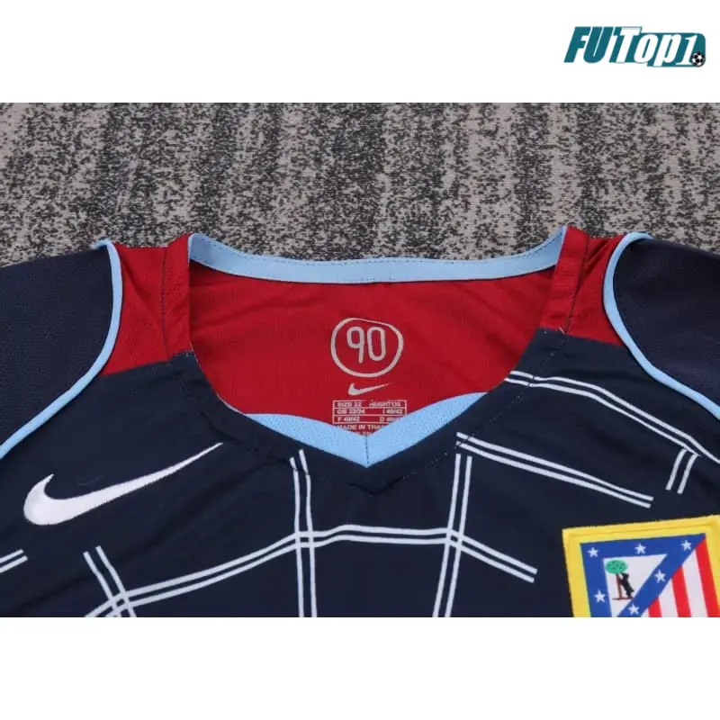 - Diseño Moderno y Clásico: Esta camiseta presenta una base azul marino con detalles en rojo y blanco, que recuerda a la segunda equipación del Atlético de Madrid de la temporada 2004/05. El escudo del club bordado le da un toque retro.