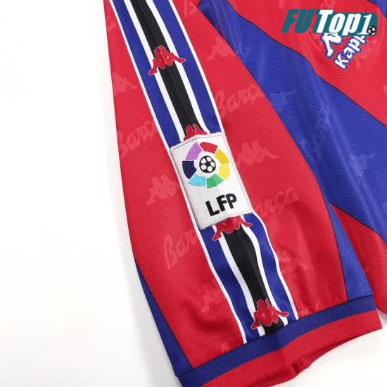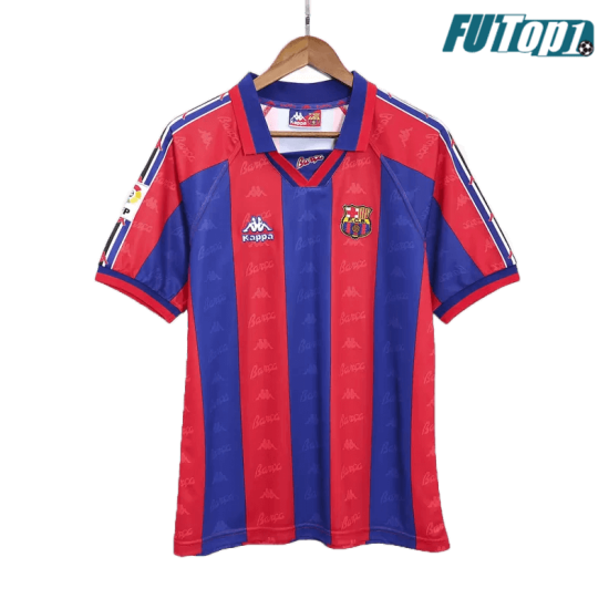- Diseño Juvenil: La camiseta presenta un diseño vibrante con franjas horizontales azules y rojas, capturando la energía juvenil de los años 90 y evocando la esencia dinámica del FC Barcelona de esa época.