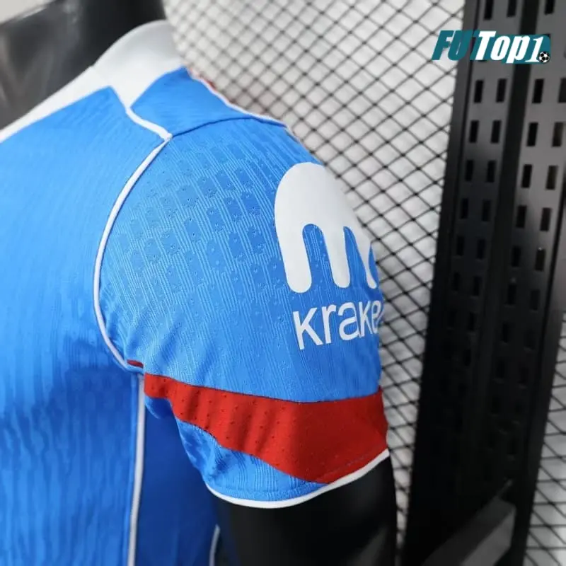 - Diseño Moderno y Clásico: Azul claro Photo Blue con patrones Total 90 retro de los 2000, detalles rojos y blancos, estilo audaz y fresco para jóvenes hinchas.