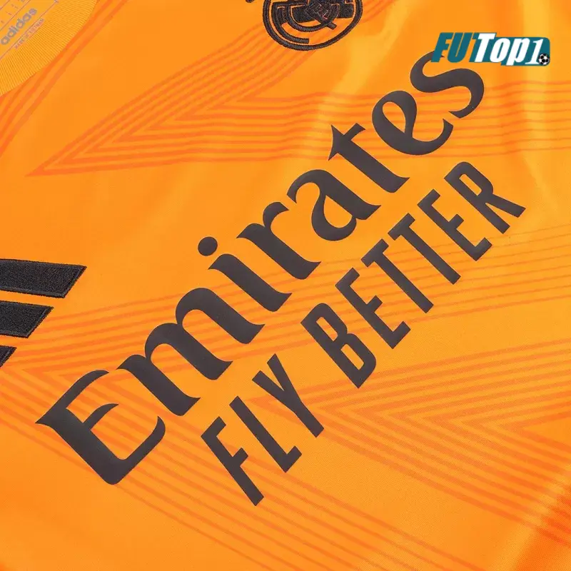 - Diseño Moderno y Clásico: Color naranja vibrante con detalles en negro, incluyendo el escudo del Real Madrid en tono monocromático y el logo de Adidas en el pecho. Las tres franjas en los hombros aportan un toque moderno.