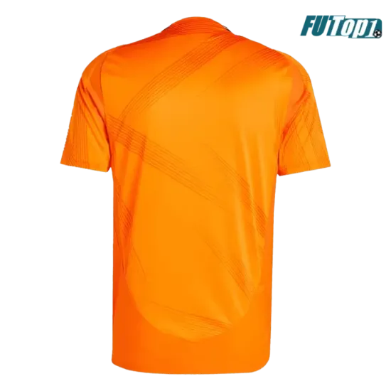 - Diseño Moderno y Clásico: Destaca un vibrante color naranja con un gráfico abstracto de inspiración estelar. Los detalles en azul oscuro evocan el cielo nocturno, simbolizando la conexión entre los madridistas en cualquier lugar del mundo.