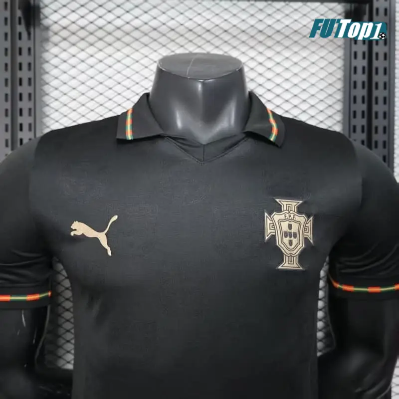 - Diseño Moderno y Clásico: Negro intenso con patrón tonal del escudo histórico portugués, inspirado en la Pantera Negra Eusébio, acentos verdes, rojos y dorados, audaz y fresco para jóvenes hinchas.